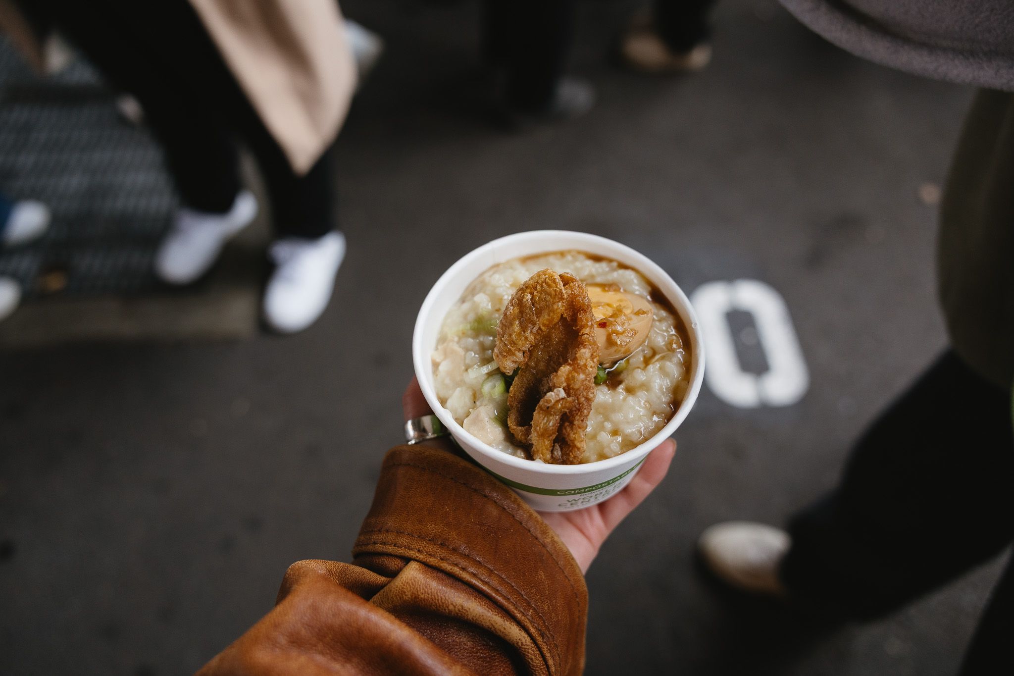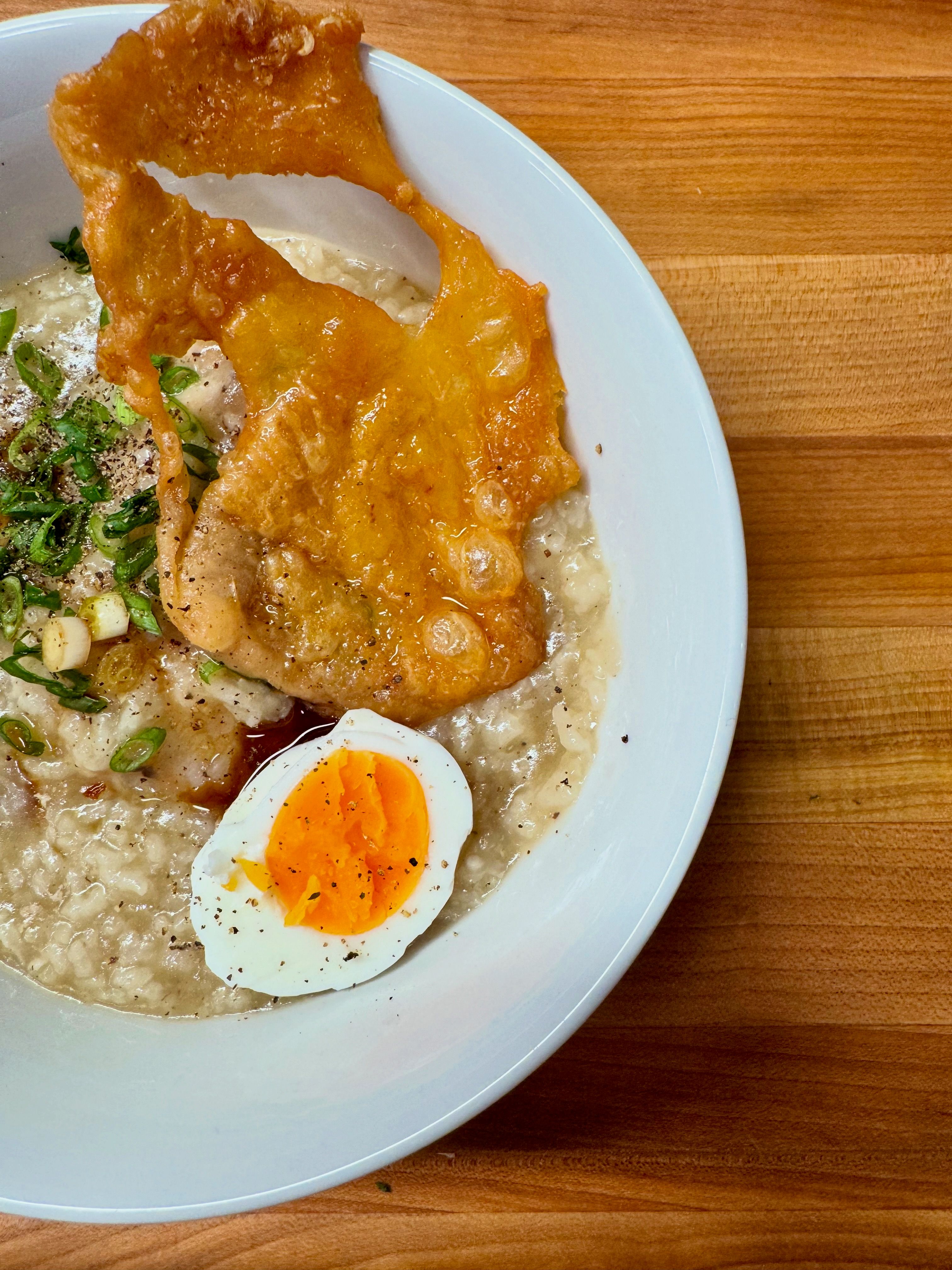 Comforting rice porridge with chicken thighs, garlic, ginger, onion, and fish sauce.